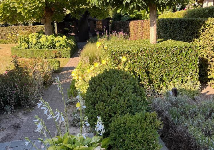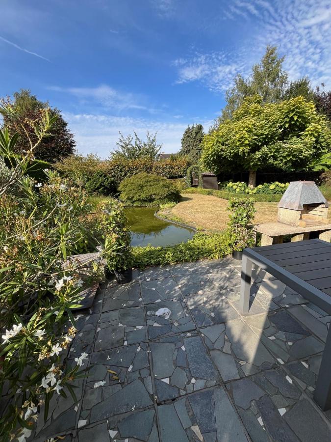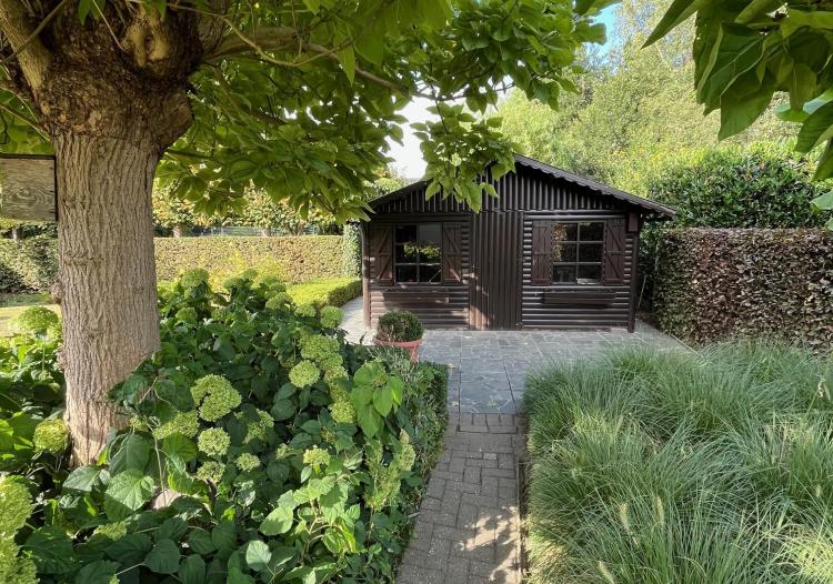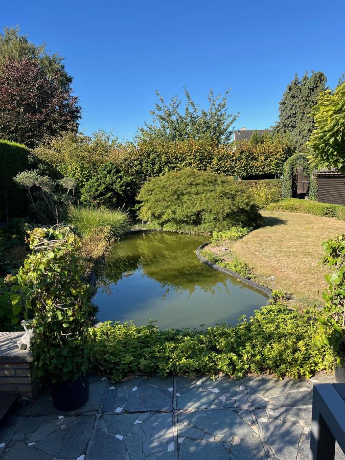 | Tuintekst | prachtig aangelegde tuin met tuinhui en vijver |